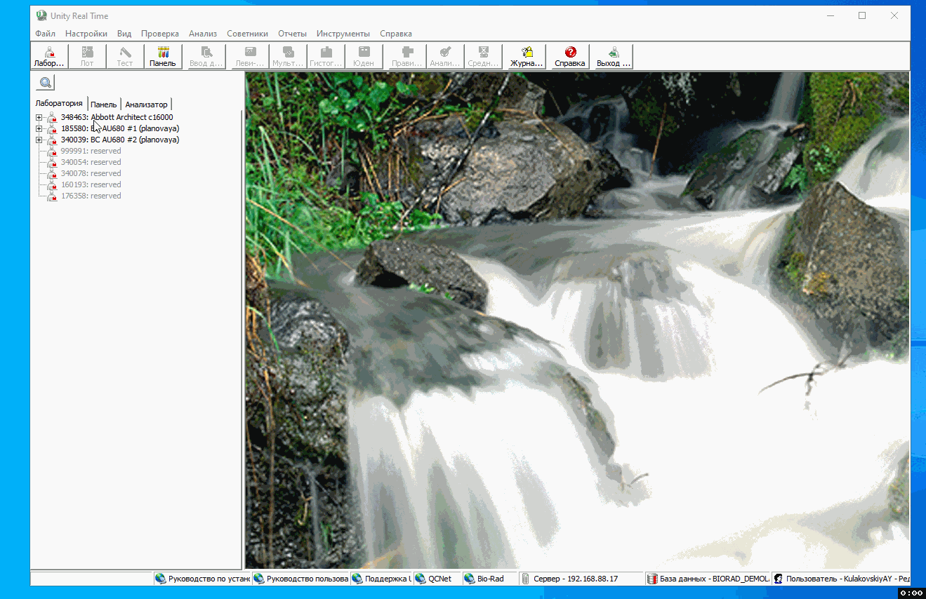 Если вы никогда не открывали Юнити, или у вас "слетел" сервер, спросите у поддержки Био-Рад имя сервера, логин, пароль и действуйте как на видео ниже (в этом примере адрес сервера 192.168.88.17):